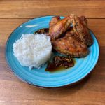 - Die Hühnerflügerl aus dem Backrohr nehmen und sofort einzeln kurz in das Sojasaucengemisch eintauchen