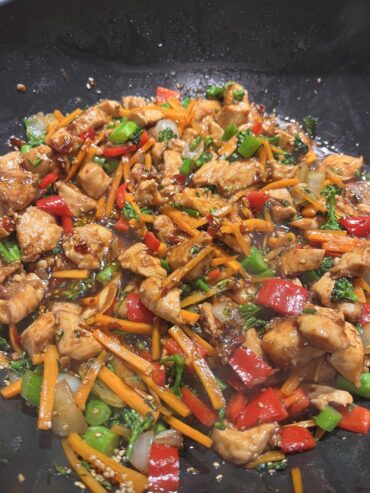 Asiatisch angehaucht ist dieses leicht süße und leicht scharfe Gericht, das relativ schnell zubereitet ist. Die Gemüsezugabe kann individuell angepasst werden. Grob geschnittene Zwiebelstücke, Paprikastreifen …