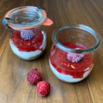- Als letzten Schritt die Himbeeren auf die Gläser verteilen und kalt stellen